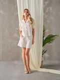 Confeccionado em linho leve com riscas verticais em tons neutros, este conjunto é perfeito para dias quentes com um toque de elegância natural.