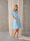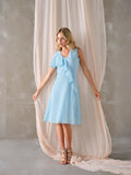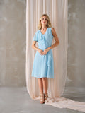 Vestido Cerimónia azul claro, com duas mangas diferentes e folho.