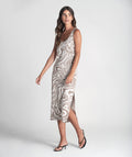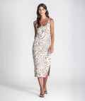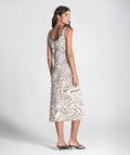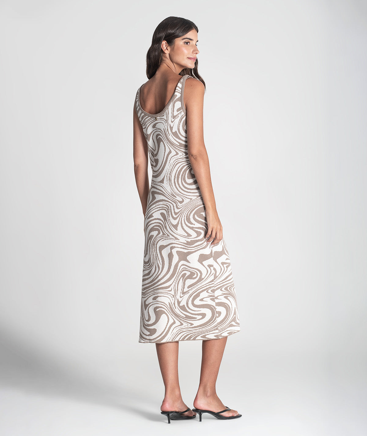 Vestido de malha de manga cava, da Ruga com desenhos diferenciados e abertura lateral.