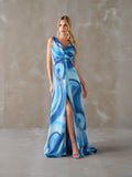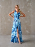 Em tons de azul que evocam o céu e o mar, esta peça destaca-se pelo seu caimento fluido e silhueta elegante. Ideal para ocasiões especiais ou eventos ao entardecer, combina delicadeza com presença marcante.