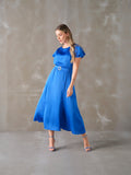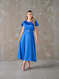 Em tom azul profundo, este modelo destaca-se pela silhueta fluida e pelo cinto com fivela de brilho, que marca delicadamente a cintura e acrescenta um detalhe glamoroso ao look. Ideal para eventos formais, jantares especiais ou celebrações que pedem sofisticação, este vestido valoriza a feminilidade com leveza e presença.